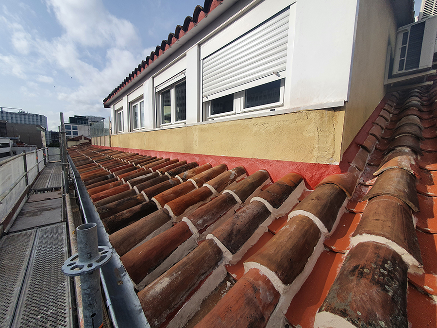 – Colocación de nueva capa de impermeabilización bajo teja y formación de arrimos acordes a los encuentros que se forman con los diferentes elementos.